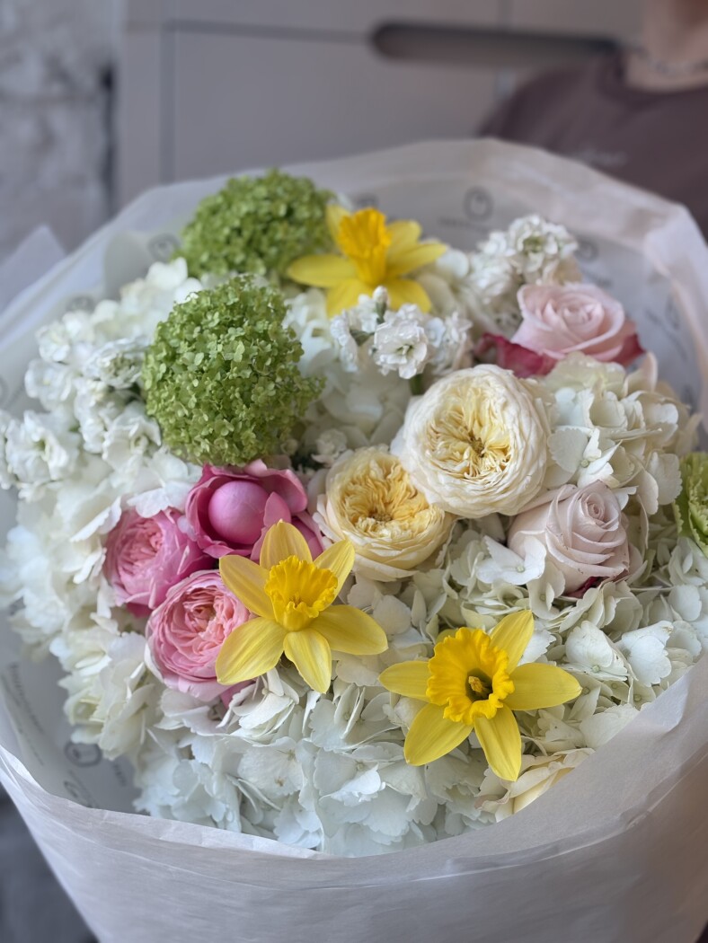 - Корзина цветовкустовые розы, гортензия, ароматная маттиола на флористической губке и в ваших руках цветочная клумба